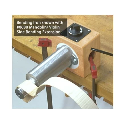 Crafted from 6-1/4″ long cast aluminum, it features variable temperature control and a versatile shape allowing a wide variety of bending radii. For bending the tight curved sides of a mandolin or violin, screw on our unique #0688 Mandolin/Violin Side Bending Extension. The sturdy wooden base can be clamped to your workbench horizontally or vertically.