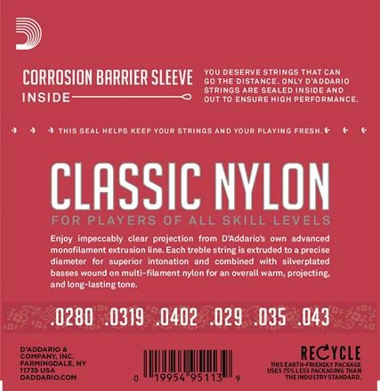 D’Addario’s Classic Nylon guitar strings are great for beginners, students and professionals alike. This normal tension set contains 3 clear nylon trebles and 3 silver-plated copper wound basses for the optimal balance of warm and projecting, long lasting tone.