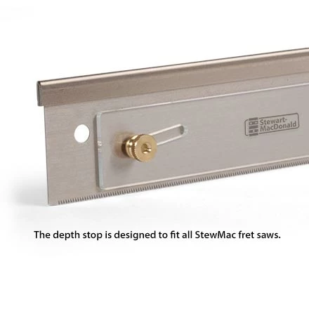 Make no mistake: this is NOT a standard hardware megamart backsaw! We started with a blade of legendary corrosion-resistant Sheffield steel, and specified .023″ width to match our fretwire. We insisted on precision pull-cut teeth, to greatly reduce blade flex and jamming in harder fingerboard woods. Lastly, we designed an easy to use, removable clear acrylic depth stop. It slides up or down, with thumbscrews to precisely set any fret slot depth.