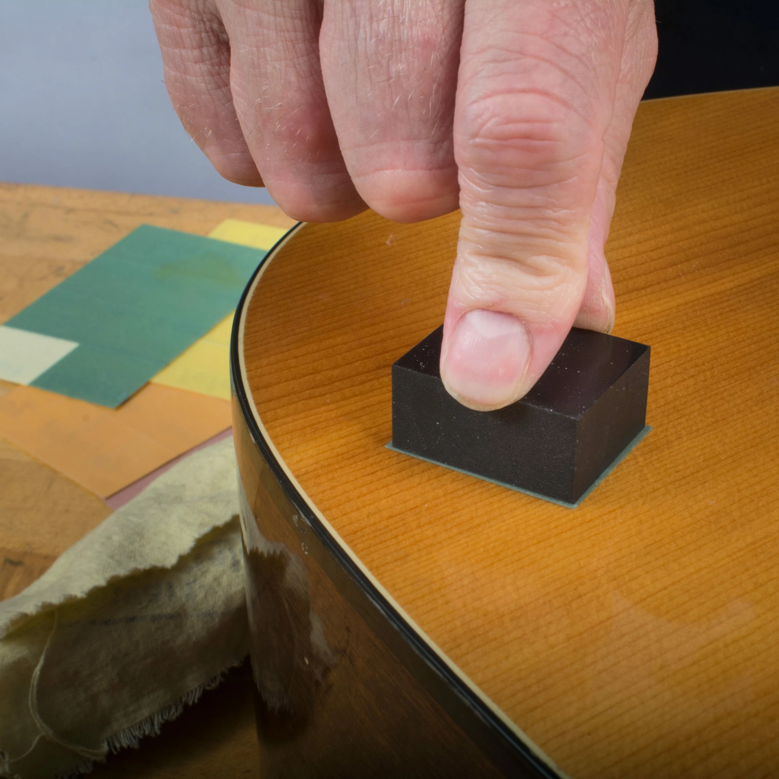 The long-lasting sanding squares are adhesive-backed for use with Toleblock sanding blocks. Toleblocks are firm, but not rock-hard: the perfect “give” for spot-sanding.