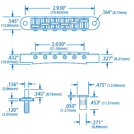 The adjustable bridge design found on current Gibson® solidbodies, with unnotched saddles with individual saddle screw retainer clips.