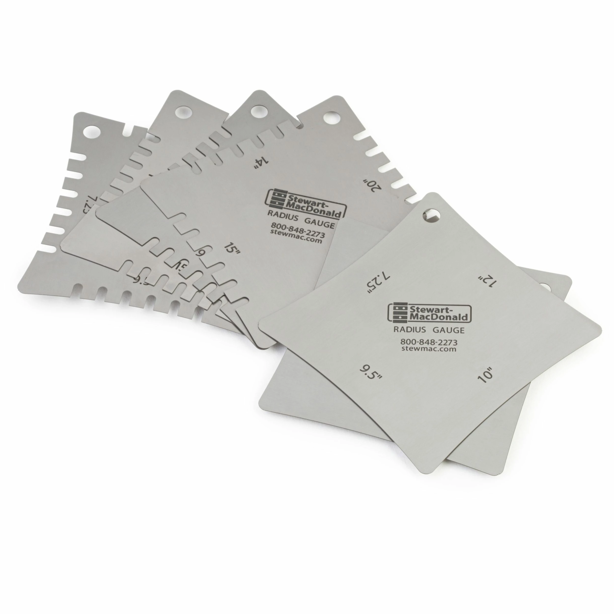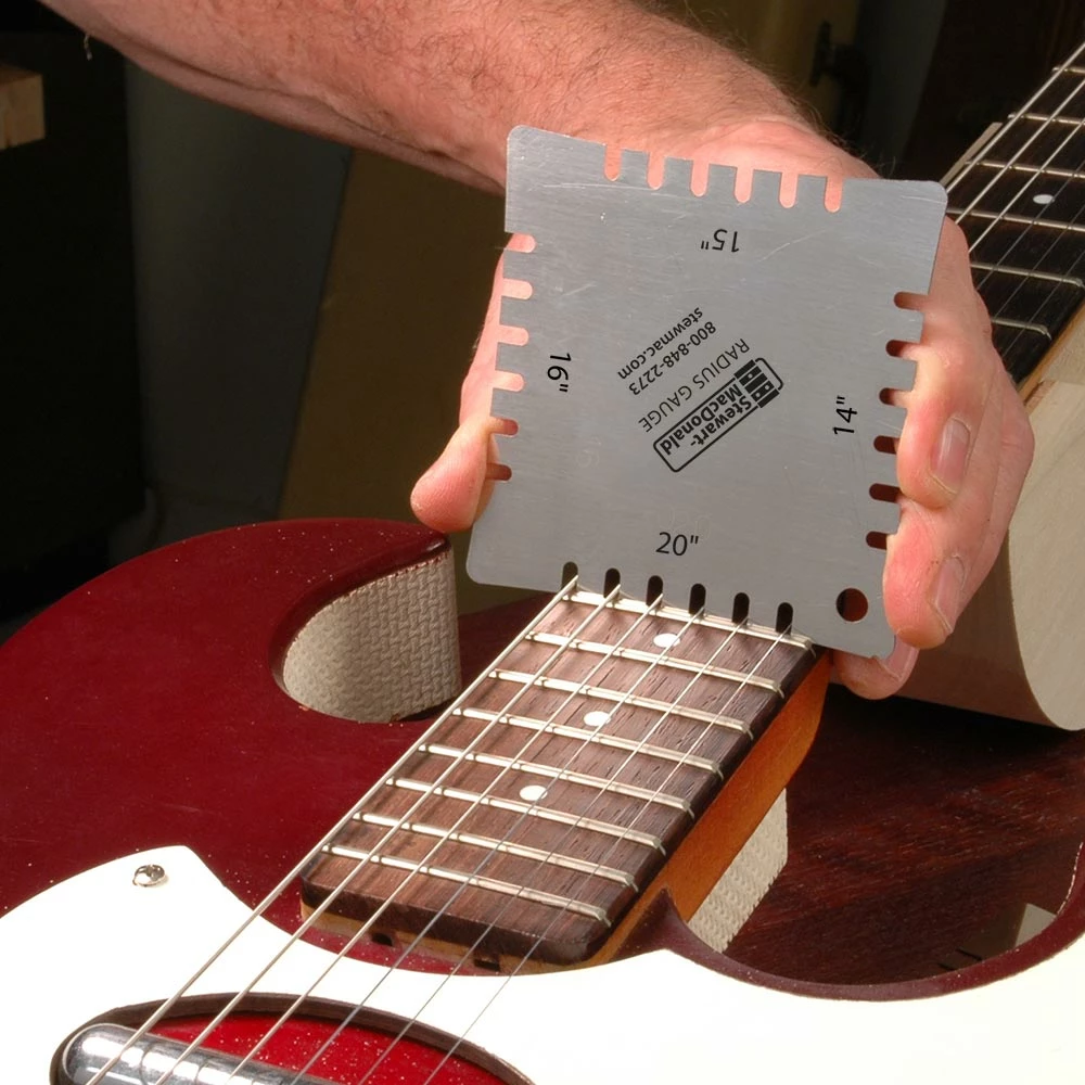 Guitars commonly have a “compound radius,” meaning the curvature changes from the nut to the end of the fingerboard. “Eyeballing” this subtle change is next to impossible; that’s why a set of radius gauges is essential. Also use them for profiling an acoustic bridge saddle and setting the string heights on an electric guitar bridge. Our gauges have precision laser-cut 7-1/4″, 9-1/2″, 10″, 12″, 14″, 15″, 16″ and 20″ radii. They’re made of stainless steel for durability in the busy shop, and work for string spreads and fingerboards up to 3-1/4″ (82.55mm) wide.