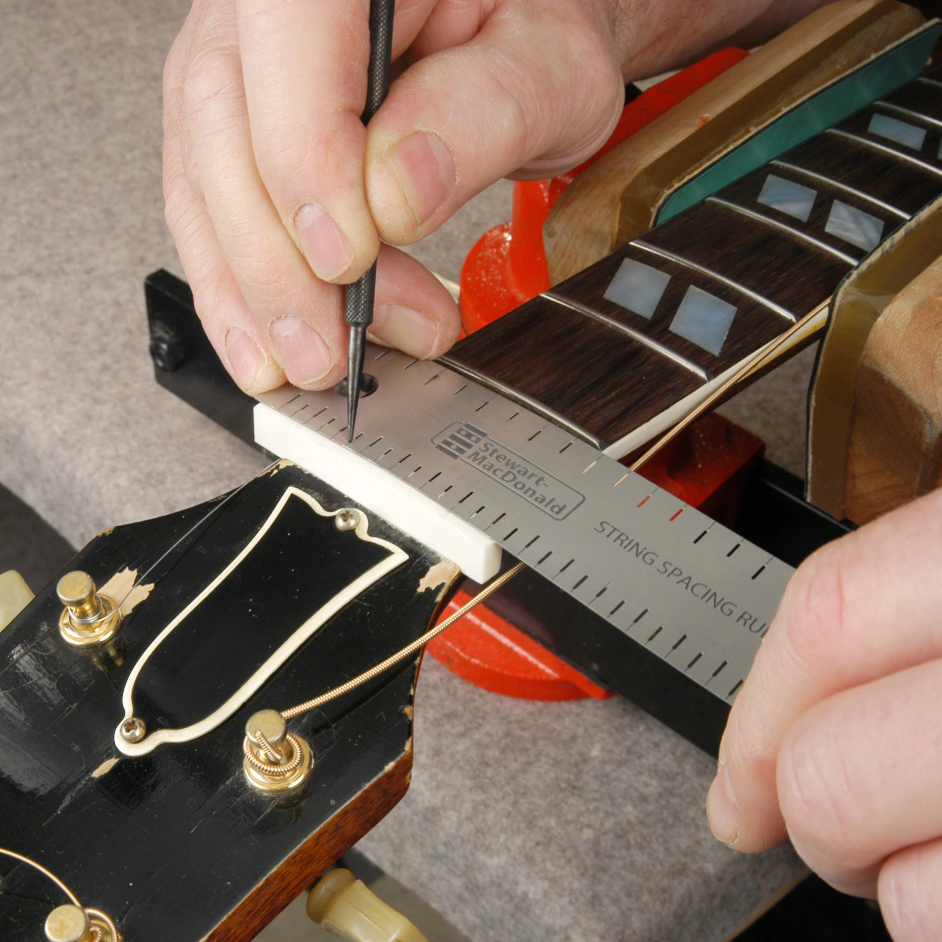 Our laser-etched stainless steel String Spacing Rule quickly finds the right spacing for just about any stringed instrument. It does all the math for you: proportional slot spacing automatically compensates for string diameters, from treble to bass, so the thicker strings won’t feel crowded to the player.